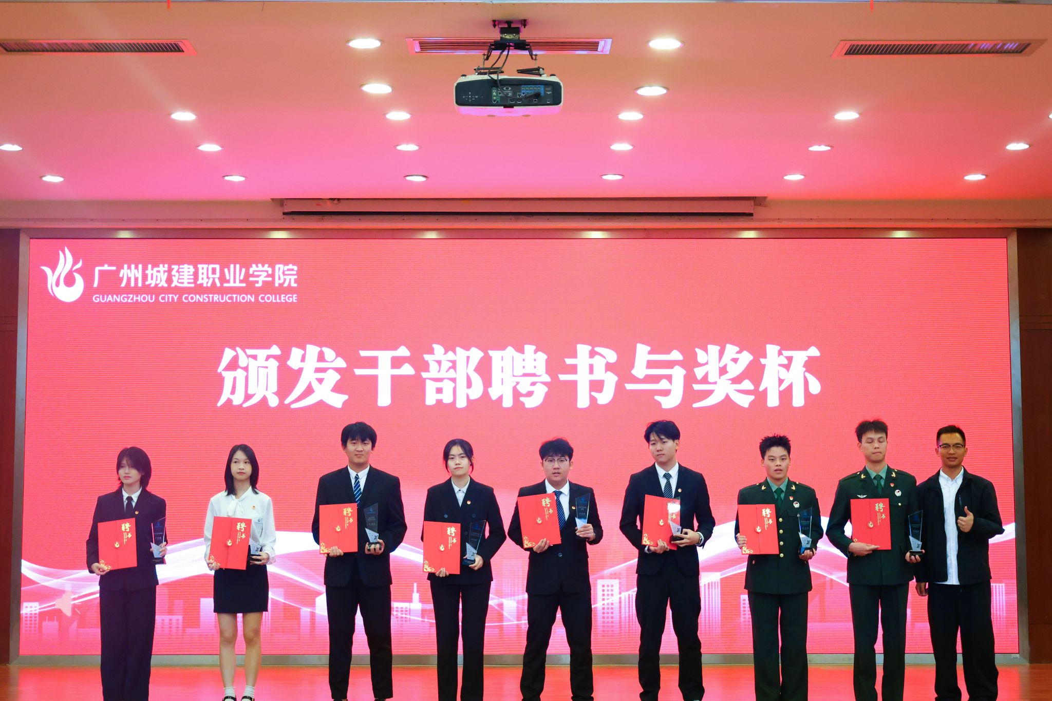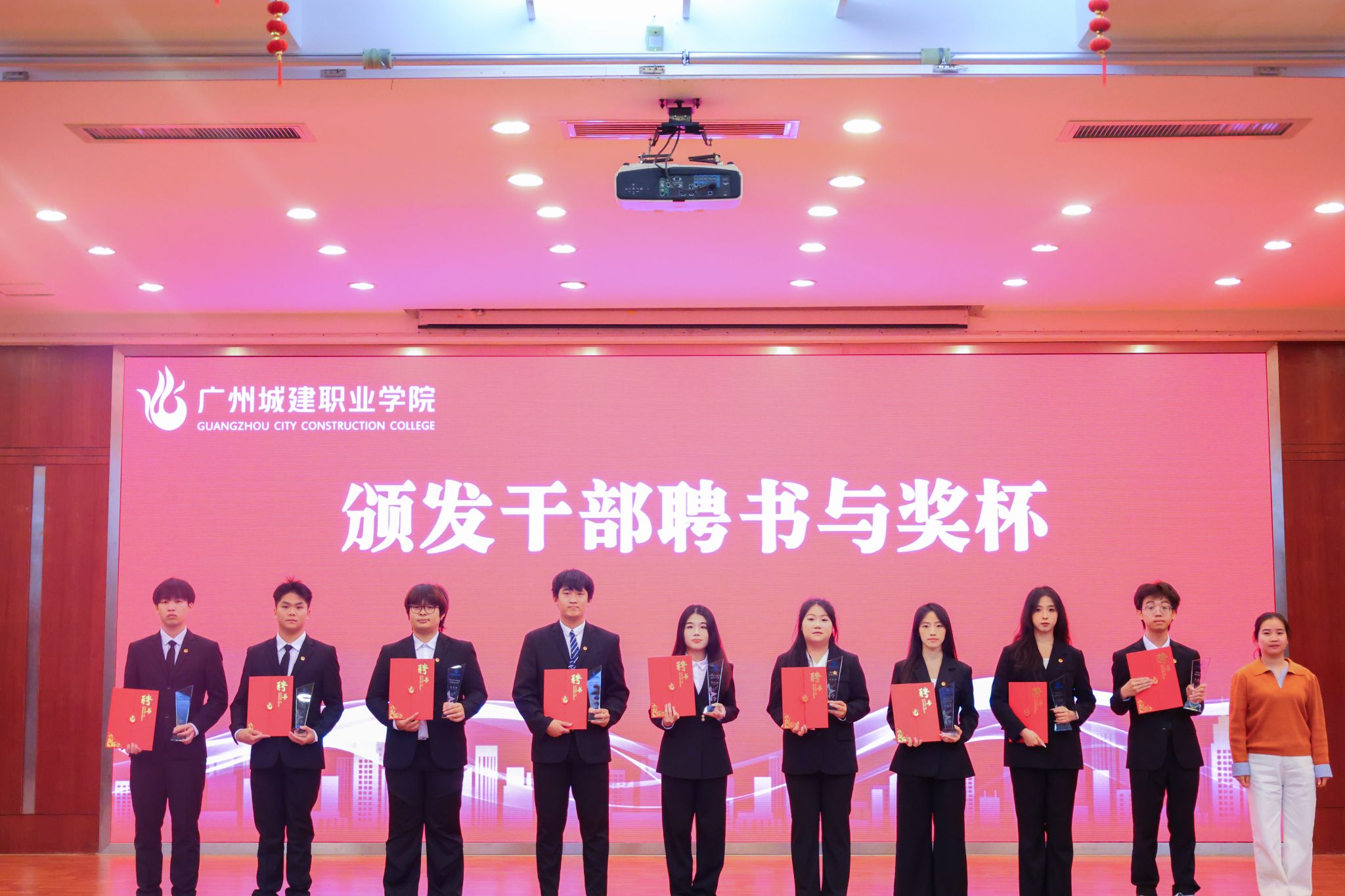 与会领导老师为学生干部颁发荣誉证书、聘书和奖杯。