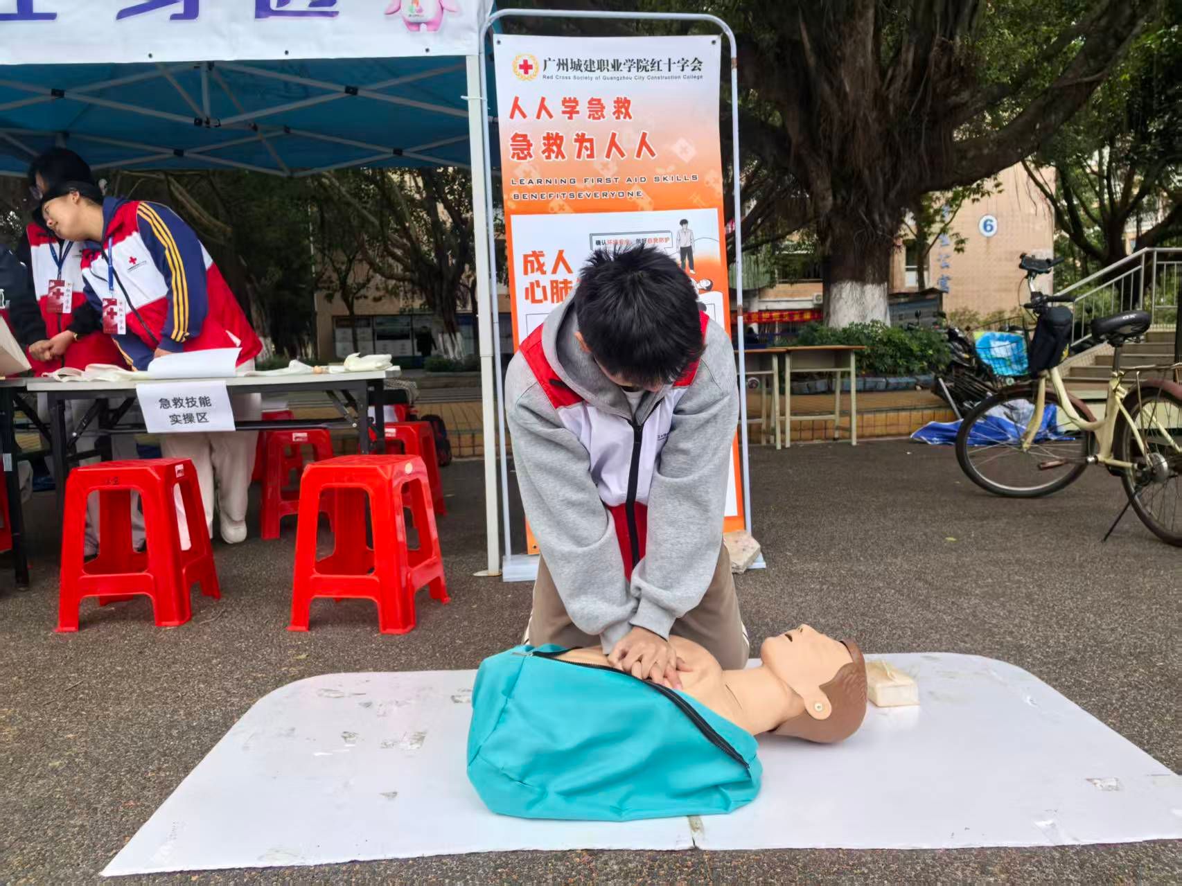 为护航十五运会和残特奥会,深化“新彩广州”全民志愿行动,提升师生应急救护意识与实操能力,11月19日,我校红十字会学生分会在二区广场举办了以“全运有你,救在身边”为主题的急救知识科普活动。本次活动面向全校师生,以“知识普及+理论讲解+实操演练”相结合的形式展开,营造了“人人学急救,急救为人人”的校园氛围。