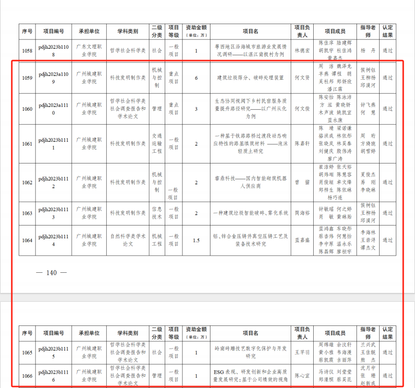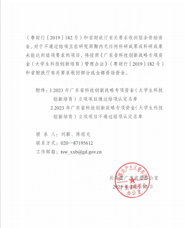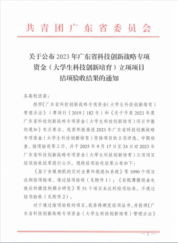 近期,根据共青团广东省委员会发布的《2023年广东省科技创新战略专项资金(大学生科技创新培育)项目结项验收结果通知》,我校8个立项项目全部顺利通过验收,成功结项。
